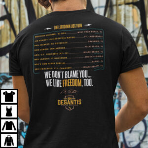 The DeSantis Shirt was inspired by rock-band touring shirts, which generally list the dates and sites on the tour. The back of the Escape To Florida shirt says “We don’t blame you … we like freedom, too,” and list eight Democrats who appeared indoors and unmasked, along with dates and sites of their holidays to Florida. The list includes the governors of states such as Michigan, Connecticut, and New Jersey.